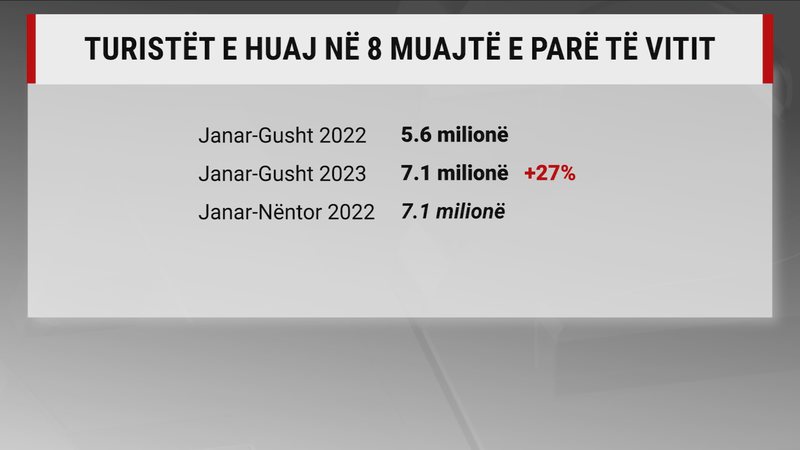 Bumi i promovimit mediatik të Shqipërisë duket se dha rezultate teksa shifrat për 8 muajt e parë të vitit ja kalojnë edhe vitit 2022. Në periudhën janar-gusht 2023 rreth 7.1 milionë turistë zgjodhën Shqipërinë për të kaluar pushimet e tyre ose thënë ndryshe rreth 27% më shumë se një vit më parë.