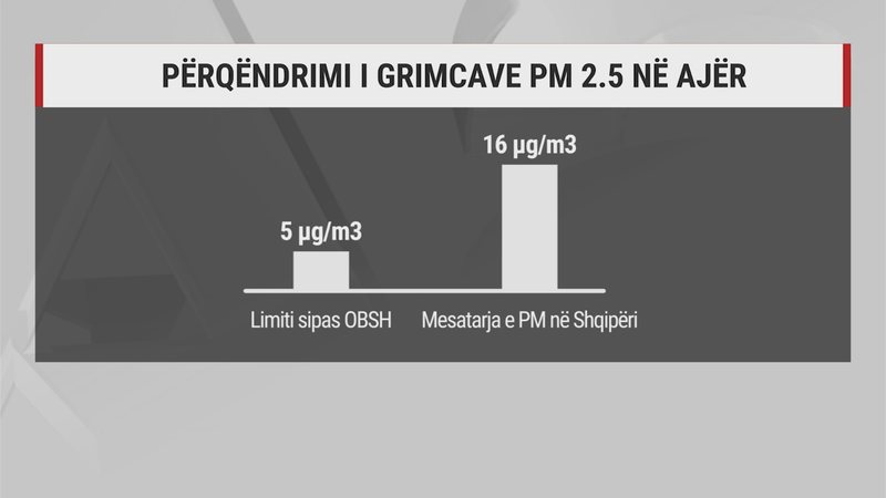 Nga 5 migro-gramë për metër kub që është limiti sipas rekomandimeve të Organizatës Botërore të Shëndetësisë, përqendrimi i grimcave të imëta të prodhuara kryesisht nga djegia e lëndëve djegëse fosile, të njohur si PM 2.5 ka rritur në 16 migro-gramë për metër kub.