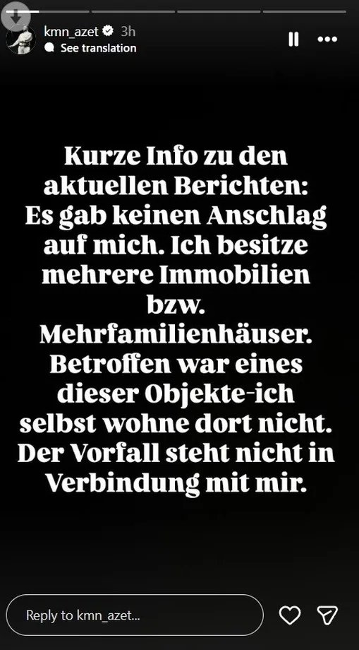Për të qartësuar situatën, ai publikoi një reagim në Instagram, duke mohuar prerë që ka qenë shënjestër e ndonjë atentati. “Nuk ka pasur asnjë atentat ndaj meje. Unë kam disa prona, përkatësisht banesa kolektive. I prekur ka qenë një nga këto objekte, unë vetë nuk banoj aty. Ngjarja nuk ka lidhje me mua”, sqaroi Azet.