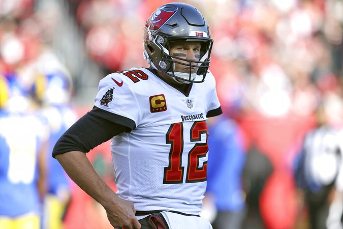 Tampa Bay Buccaneers quarterback Tom Brady (12) reacts after being penalized during the first half of an NFL divisional round playoff football game against the Los Angeles Rams Sunday, Jan. 23, 2022, in Tampa, Fla. (AP Photo/Mark LoMoglio)