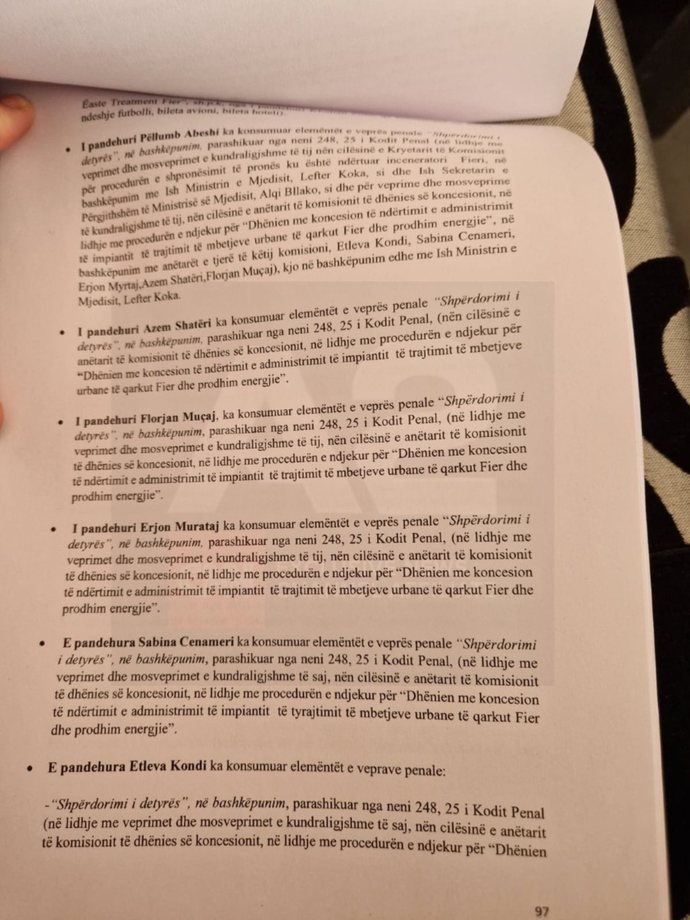 Për të pandehurit e tjerë të dosjes, anëtarët e komisionit të dhënies së koncensionit dhe administratorët e kompanive, që kanë marrë shuma parash për punime që nuk i kanë kryer në të vërtetë, janë ngritur përkatësisht akuza të “shpërdorimit të detyrës” dhe “pastrim të parave”. (A2 Televizion)