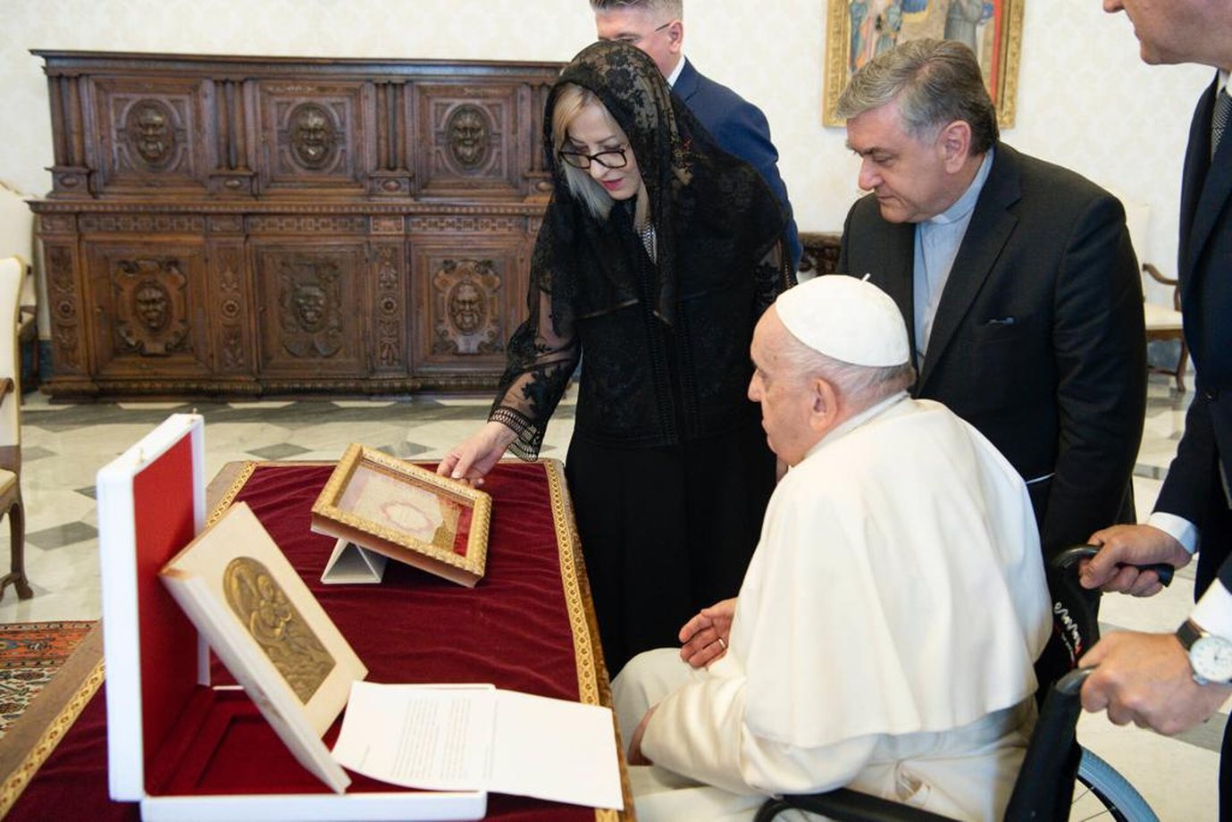 Në përfundim të takimit, Papa Françesku i përcolli Kryetares së Kuvendit urimet më të mira për popullin shqiptar, shoqëruar me bekimin tij apostolik. (A2 Televizion)