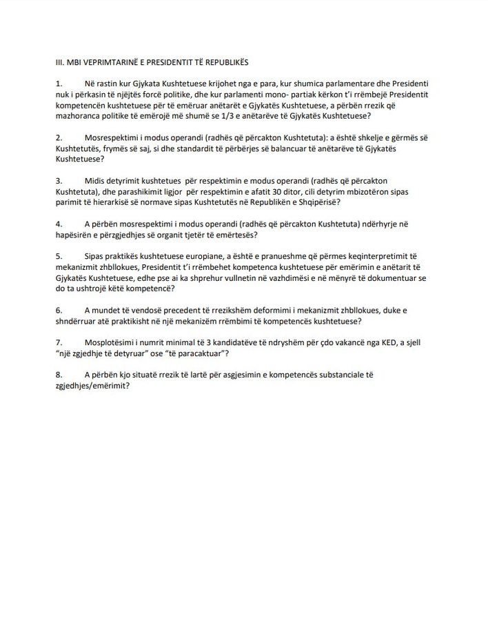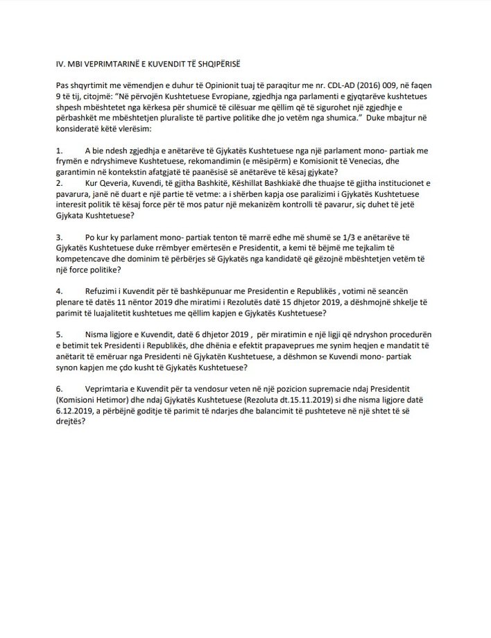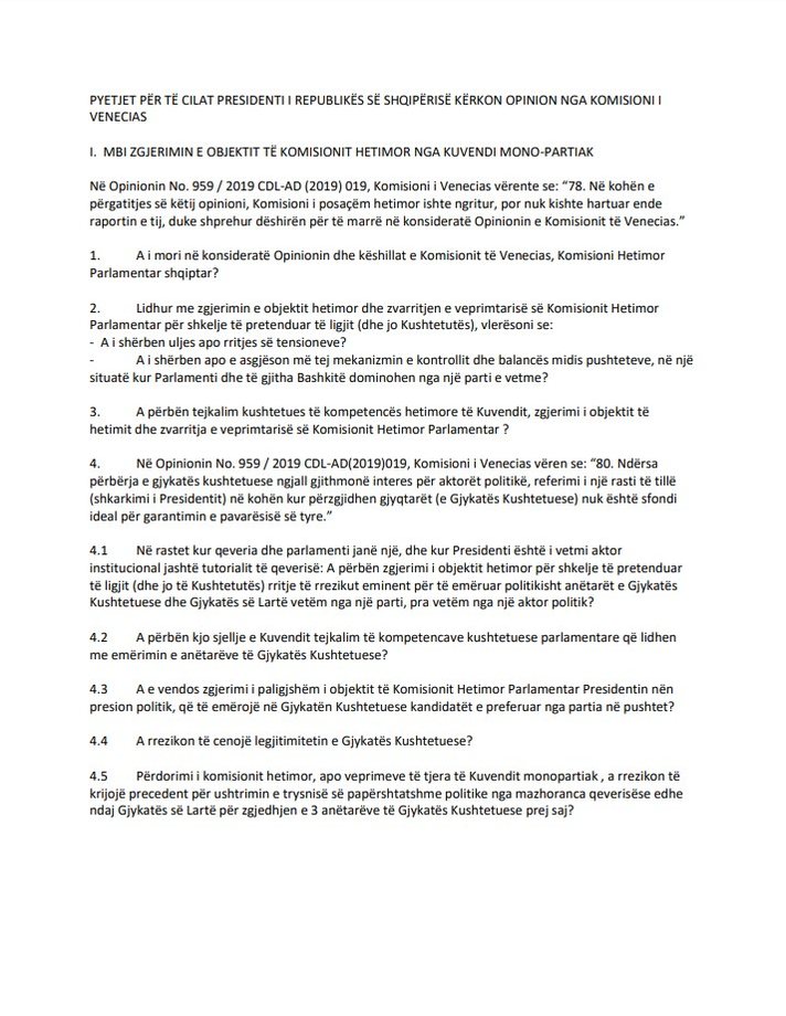 Komisioni i Venecias, ka konfirmuar zyrtarisht se ka pranuar kërkesën e Presidentit të Republikës, Ilir Meta për dhënien e një opinioni për veprimtarinë antikushtetuese të Kuvendit të Shqipërisë dhe Kryetarit të KED-së, Ardian Dvorani në procesin e emërimit të dy anëtareve të Gjykatës Kushtetuese, Elsa Toska dhe Fiona Papajorgji.