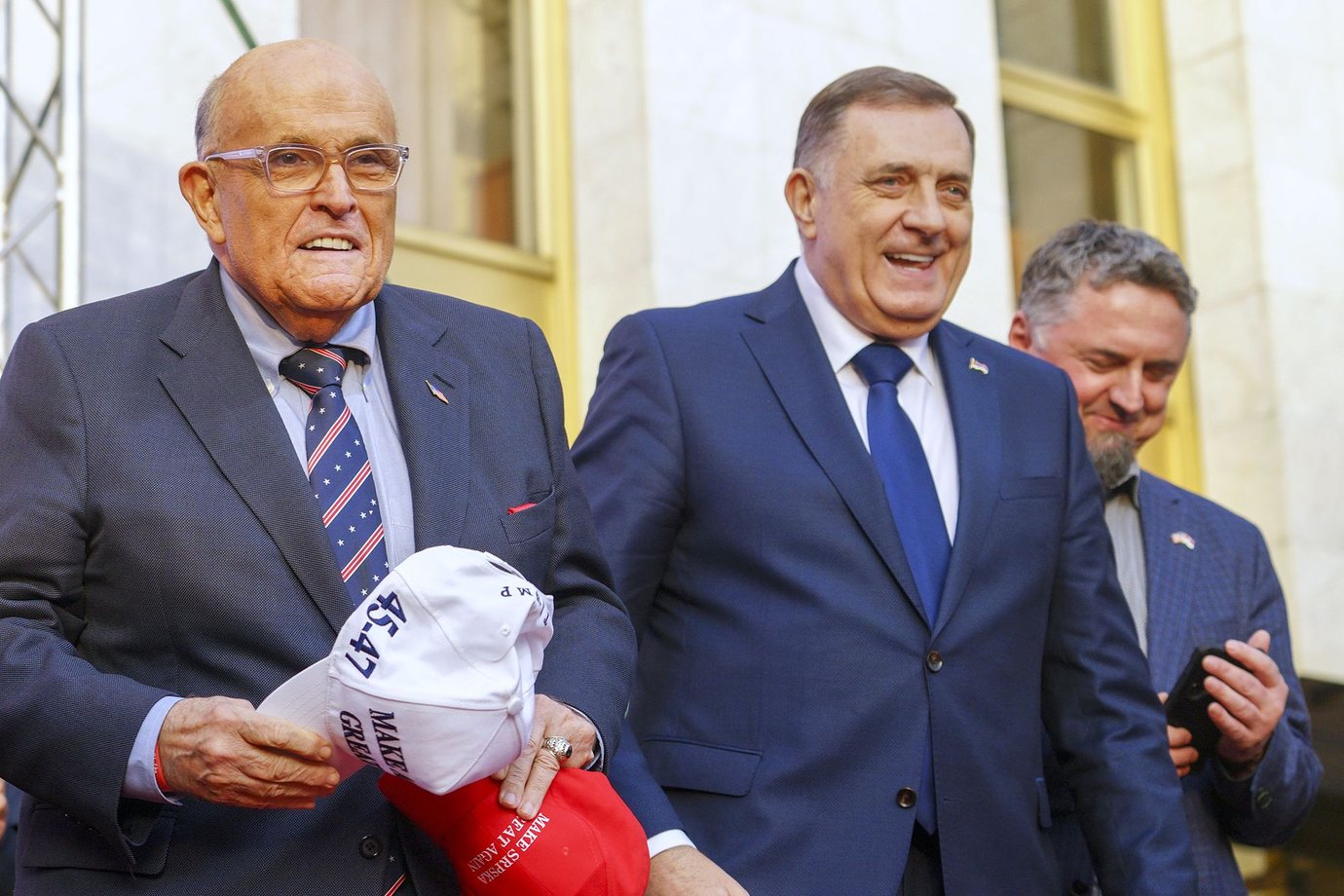 Rudy Giuliani, ish-kryebashkiaku i Nju-Jorkut dhe dikur avokati personal i Trump-it, vizitoi Republikës Srpska në shkurt dhe e ftoi Dodik-un në podcast-in e tij, ku shfaqi kapele “Make Srpska Great Again” përkrah kapelave të famshme MAGA.