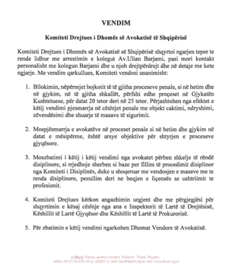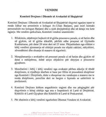 Burime për A2 CNN bëjnë të ditur se ky vendim ka ardhur pas arrestimit të avokatit Ulian Barjamit.