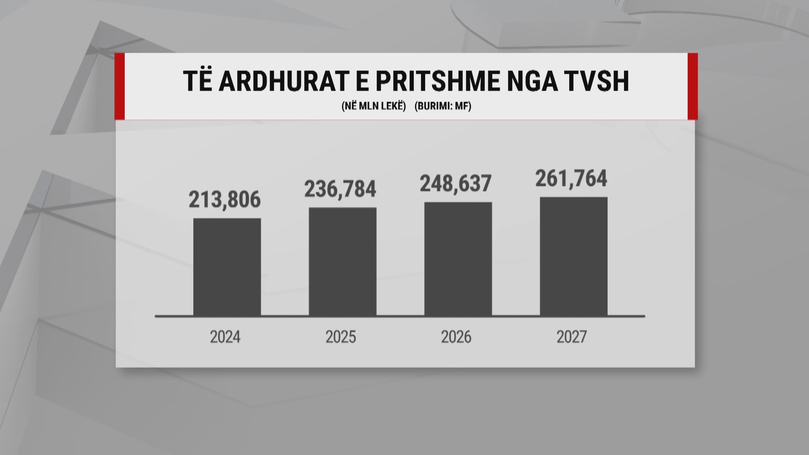 Konkretisht Ministria e Financave planifikon të mbledhë më shumë para nga Tatimi mbi Vlerën e Shtuar mbi produktet që konsumojmë. Nga më pak se 214 miliardë lekë këtë vit, arkëtimet nga TVSH në vitin 2027 pritet të kapin shifrën e gati 262 miliardë lekë.