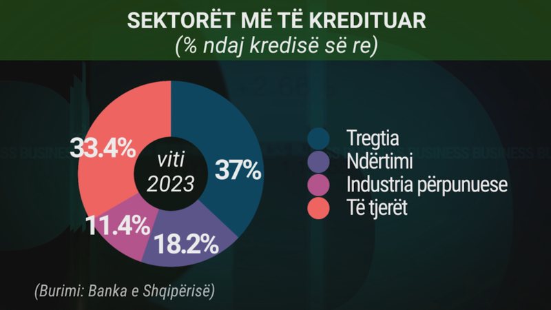 Tregtia ngelet dominuese në strukturën e kredisë për ekonominë, me pothuajse 37% të volumit total të disbursimeve të reja. Megjithëse kërkesa e brendshme ka shfaqur sinjale dobësie, për shkak të rritjes së ndjeshme të çmimeve dhe emigracionit, shtimi i numrit të turistëve të huaj duket se e ka kompensuar pjesërisht këtë efekt. Sektori i dytë më i kredituar i ekonomisë edhe vitin e kaluar ishte ndërtimi, me 18.2% i totalit. Kredia për ndërtimin po përjeton një cikël të ri rritjeje, i nxitur nga zhvillimet në sektorin e pasurive të paluajtshme, sidomos në kryeqytet dhe bregdet. Ndërsa sektori i tretë më i kredituar rezulton industria përpunuese, me 11.4% e totalit. Sektori i tretë më i kredituar i ekonomisë ishte industria përpunuese, me 24.8 miliardë lekë, ose sa 11.4% e volumit total të disbursimeve të reja.