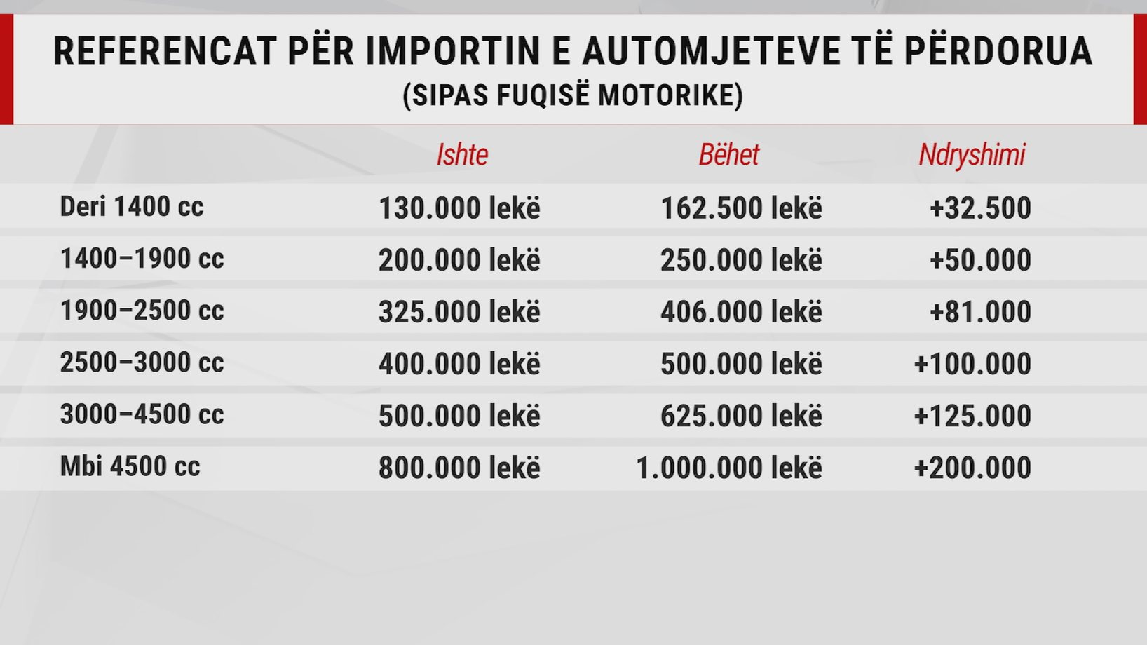 Për automjetet me cilindratë nga 1900 e deri në 2500 kubikë, vlera dysheme rritet në 406 mijë lekë nga 325 mijë që ka qenë nga viti 2018 e deri më tani.