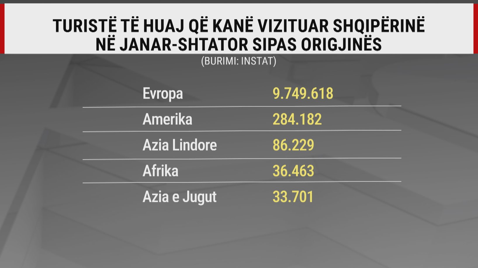 Të dhënat nga INSTAT tregojnë se pjesa më e madhe e turistëve të huaj të ardhur deri në shtator, mbi 9.7 milionë janë nga shtetet evropiane, ndjekur nga ata nga Amerika, Azia dhe Afrika.