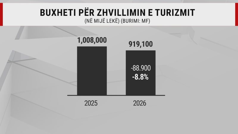 Turizmi do të ketë më pak para në dispozicion për vitin e ardhshëm. Nga mbi 1 miliardë lekë këtë vit, buxheti për sektorin që është kthyer në motorin kryesor të rritjes ekonomike të vendit reduktohet në 919 milionë lekë. Tkurra përllogaritet në 88.9 milionë lekë apo 8.8 për qind.
