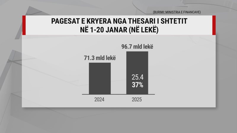 Të dhënat nga Ministria e Financave tregojnë se deri më 20 janar kanë dalë nga arka e shtetit 35.4 miliardë lekë apo 37 për qind më tepër para se në po të njëjtën periudhë kohore të një viti më parë.