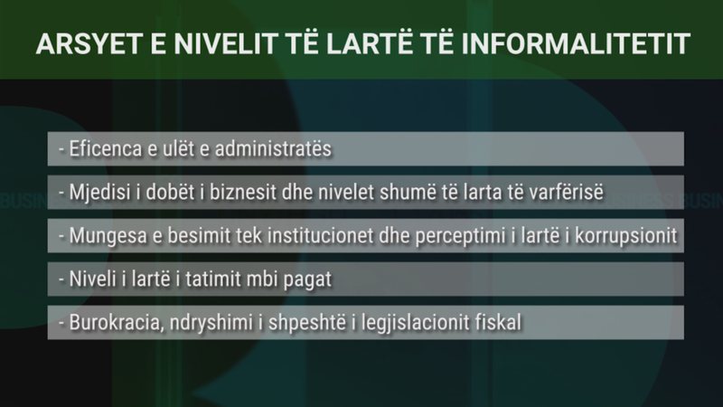 Në fakt janë disa, që nisin me eficencën e ulët të administratës; mjedisin e dobët të biznesit dhe nivelet shumë të larta të varfërisë; mungesën e besimit tek institucionet dhe perceptimin e lartë të korrupsionit; nivelin e lartë të tatimit mbi pagat; si dhe burokracitë e ndryshimi i shpeshtë i legjislacionit fiskal. (A2 Televizion)