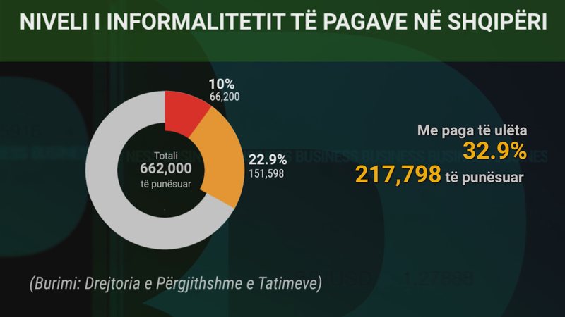 Në Shqipëri, informaliteti në tregun e punës është i përqendruar kryesisht tek paga e ulëta. Rreth 33% e totalit të punonjësve në vend ose mbi 217 mijë të punësuar janë me paga nën minimalen ose me paga minimale.