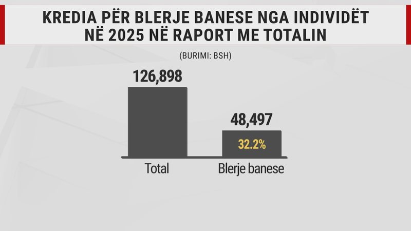 Të dhënat nga Banka Qendrore tregojnë se për blerje banesash vitin e shkuar, vetëm për blerje apartamentesh u morën nga bankat plotë 48.5 miliardë lekë kredi nga qytetarët. Kjo shumë është sa 32.2 për qind e huasë së re të dhënë për individët vjet..