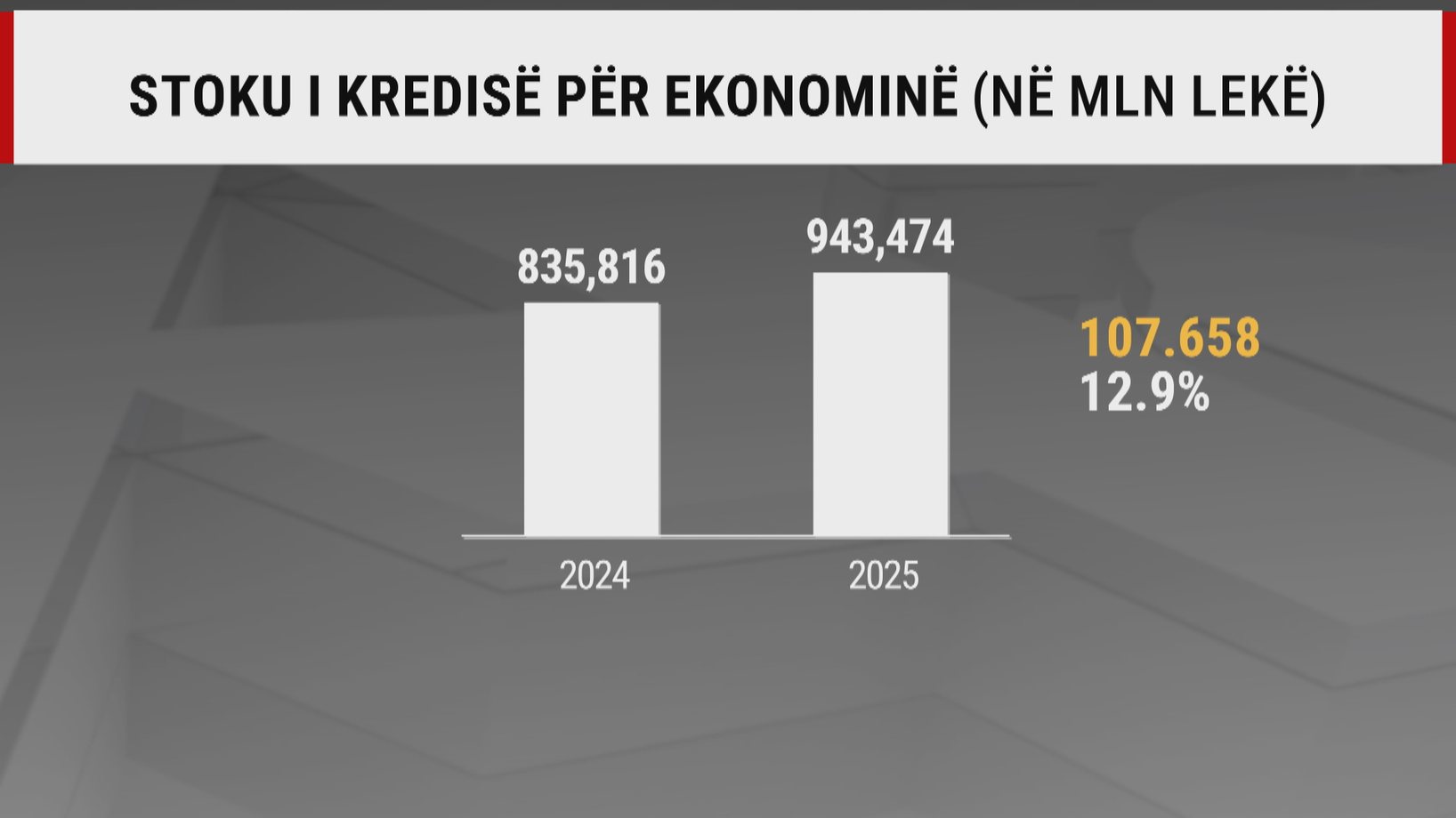 Të dhënat nga Banka Qendrore tregojnë se stoku total i kredisë së dhënë nga bankat deri në fund të vitit të shkuar kapi shifrën e 943.5 miliardë lekëve. Krahasuar me vitin 2024, totali i huave u zgjerua me 107.6 miliardë lekë apo 12.9 për qind.