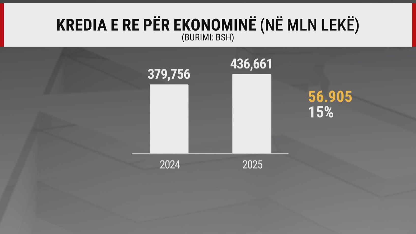 Qytetarët dhe sipërmarrësit shqiptarë morën gati 437 miliardë lekë kredi vitin e shkuar. Të dhënat nga Banka e Shqipërisë tregojnë se në raport me 2024-n, huaja e re u zgjerua me 56.9 miliardë lekë apo 15 për qind.