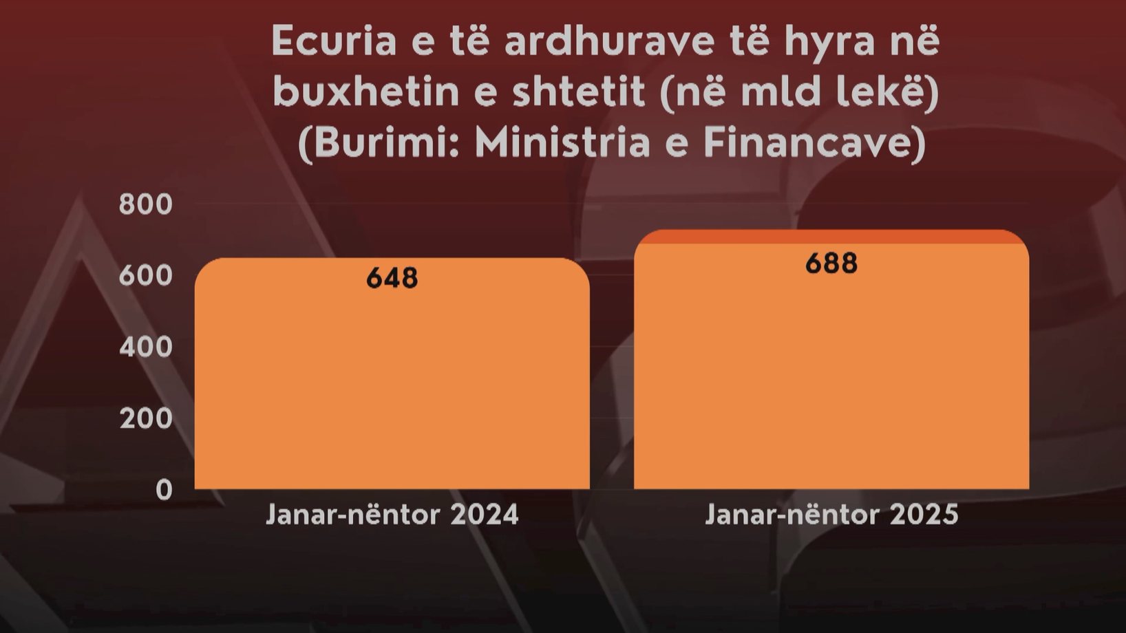 Kryesisht nga çmimet dhe fitimet e individëve e bizneseve, në arkën e shtetit u futën gati 688 miliardë lekë deri në nëntor. Të dhënat nga Ministria e Financave tregojnë se në krahasim me janar-nëntorin e shkuar, të ardhurat në buxhetin e shtetit janë zgjeruar me 39.7 miliardë lekë apo 6.1 për qind.