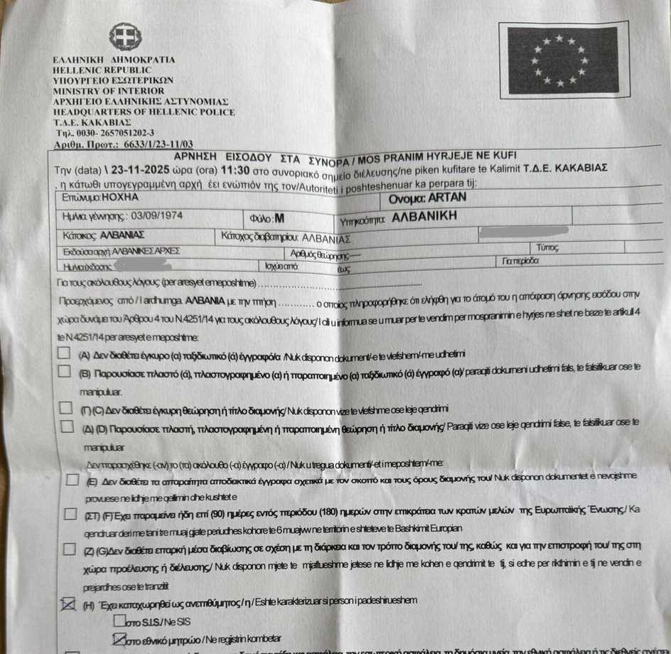 Autoritetet e Republikës së Greqisë, kanë shpallur “non grata”, gazetarin investigativ Artan Hoxha, duke e cilësuar “të padëshirueshëm” dhe kërcënim për rendin publik, duke ndaluar përjetësisht për të mos shkelur në territorin grek, raporton A2 CNN.