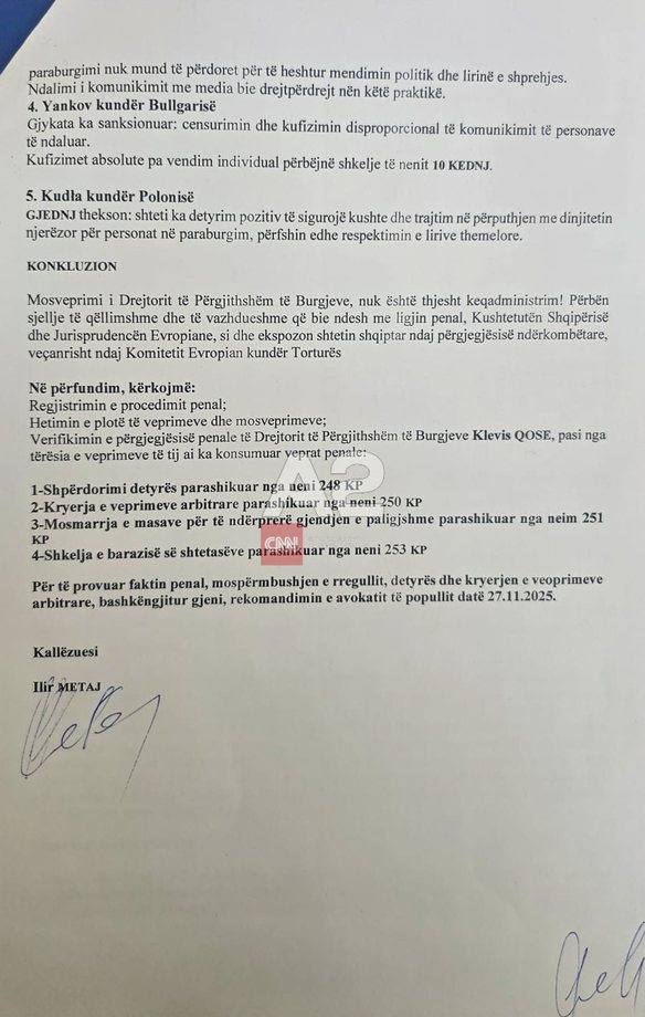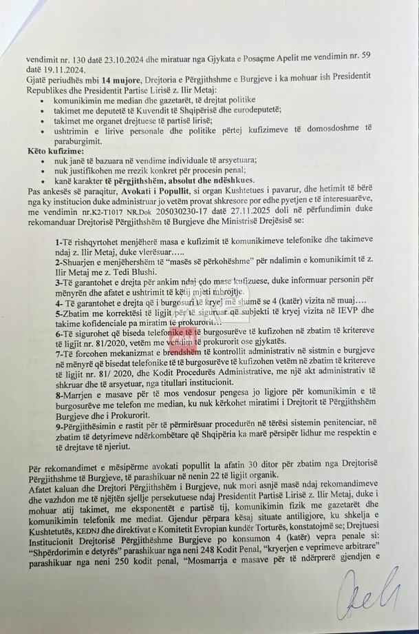 Për të provuar faktin penal, Meta bashkëngjitur kërkesës ka dërguar edhe rekomandimin e Avokatit të Popullit, për trajtimin e personave që ndodhen në paraburgim.