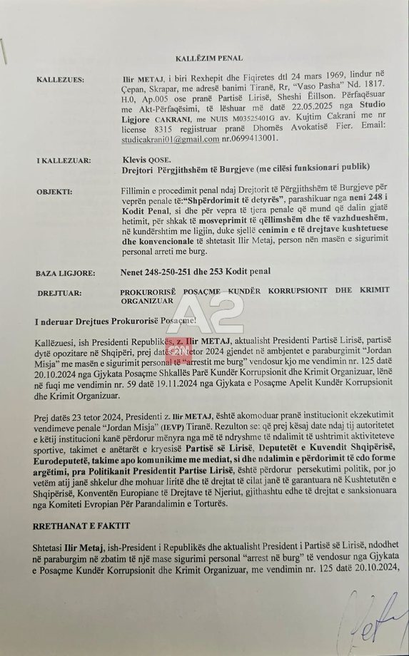 Presidenti i Partisë së Lirisë, Ilir Meta, ka depozituar kallëzim penal në SPAK ndaj drejtorit të Përgjithshëm të Burgjeve, Klevis Qose.