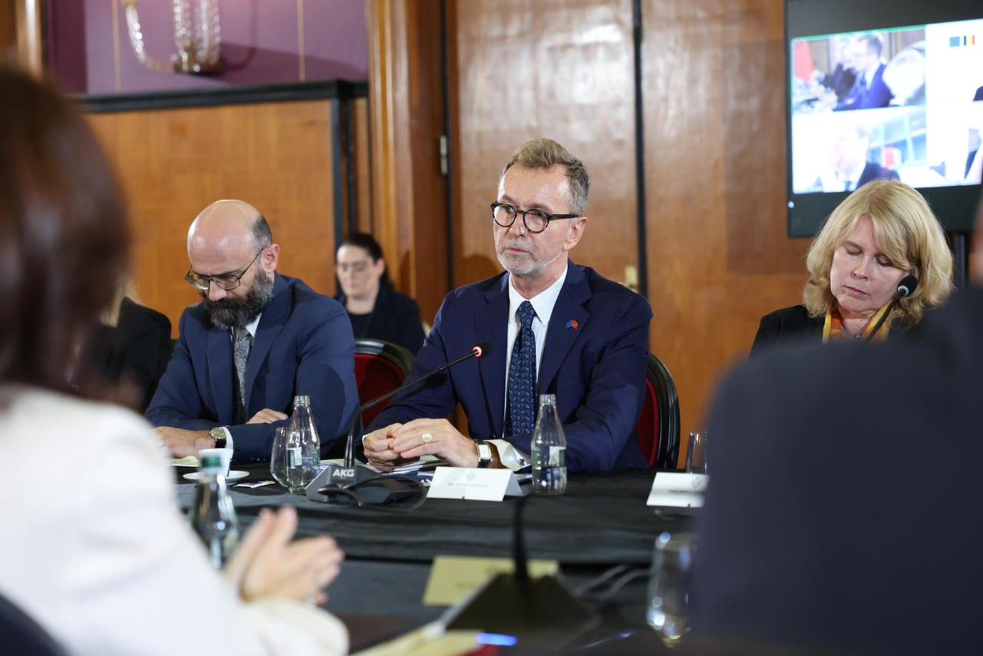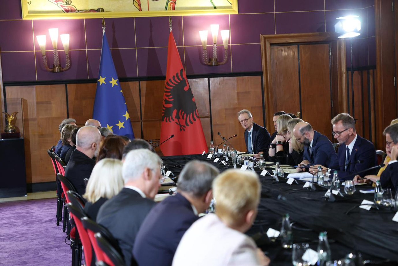 Të pranishme në takim ishin edhe ministrja e Jashtme Elisa Spiropali dhe ministrja për Administratën Publike dhe Antikorrupsionin, Adea Pirdeni.