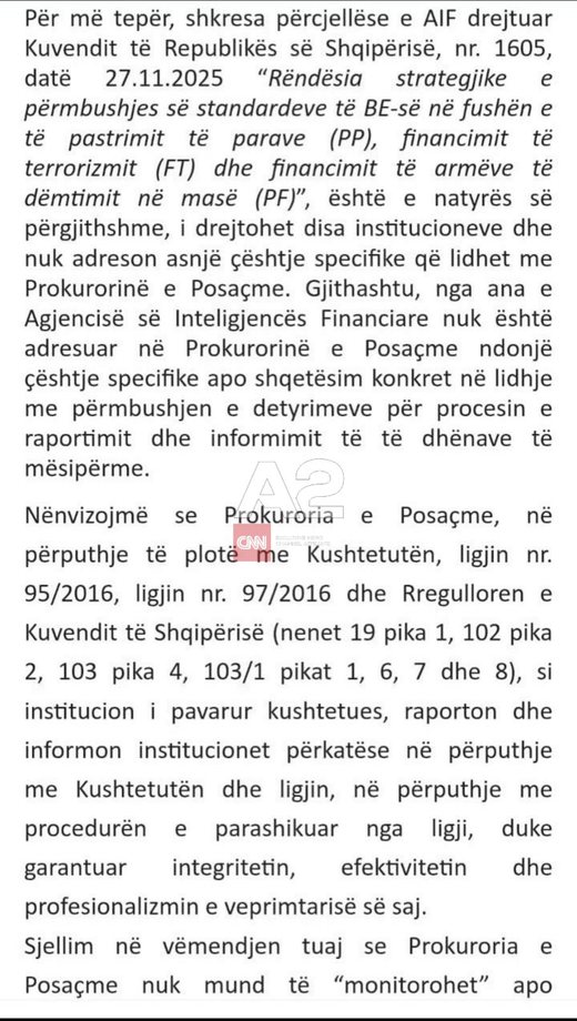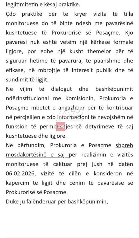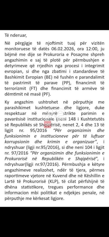 Sipas shkresës që A2CNN disponon, kërkesa mbështetej në një dokument të Agjencisë së Inteligjencës Financiare dhe parashikonte zhvillimin e takimit më 6 shkurt 2026. Por SPAK e refuzoi kërkesën, duke argumentuar se një vizitë e tillë cenon pavarësinë kushtetuese të Prokurorisë së Posaçme dhe përbën kapërcim të ligjit.