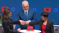 Komisionerja e Zgjerimit, Marta Kos, në fund të konferencës për shtyp në Bruksel, bëri dhuratë një tortë me ngjyrat kuqezi dhe me numrin 6, që simbolizon hapjen e të gjithë grupkapitujve të negociatave.