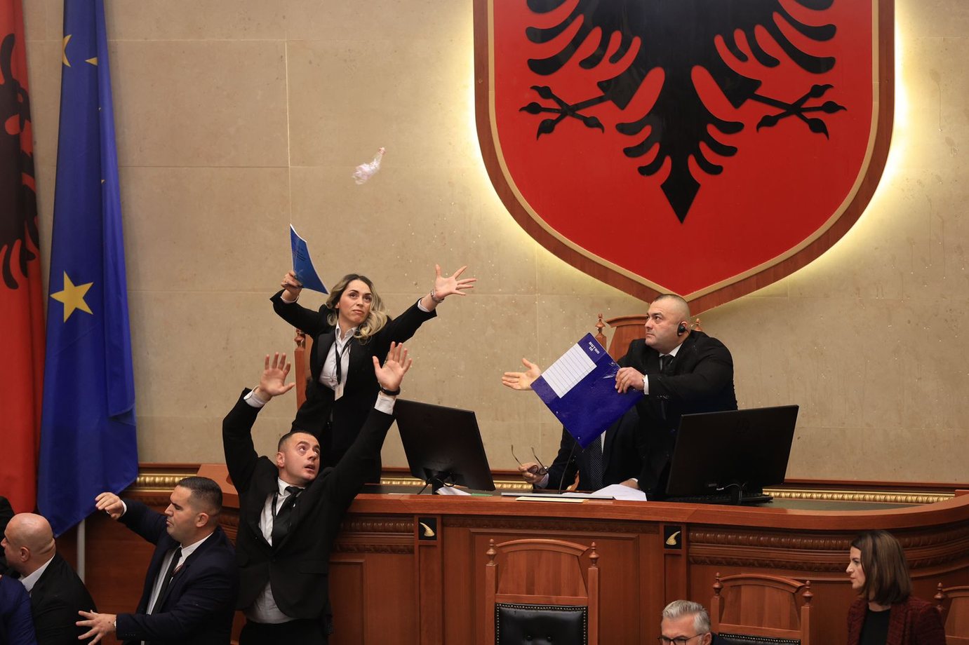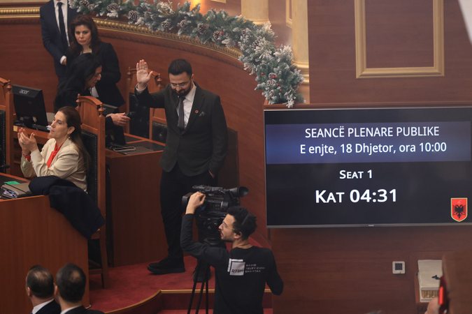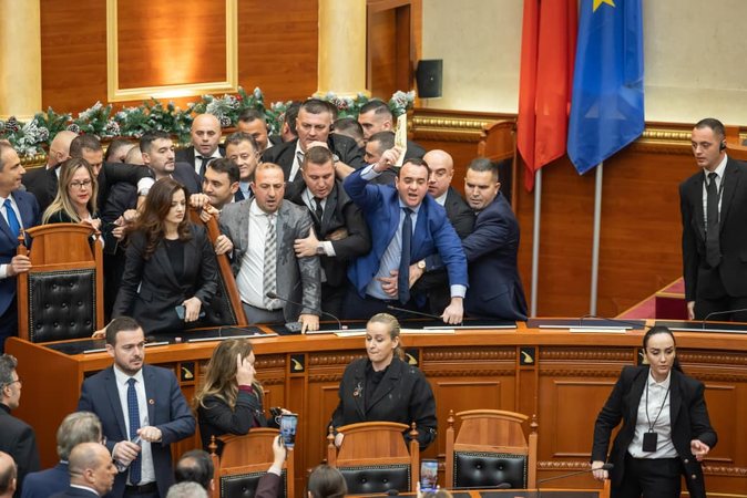 Skena kaotike mëngjesin e të enjtes në Parlamentin e Shqipërisë, pasi deputetët e opozitës u përplasën me gardistët në përpjekje për të bllokuar seancën. Fillimisht ata bllokuan disa prej ulëseve të ministrave, për të mos lejuar ceremoninë e betimit të Avokatit të ri të Popullit, Endrit Shabani, por ai gjithsesi u betua mes flakadanëve, duke u larguar nga salla pasi i dhuroi edhe një puthje deputetëve opozitarë.