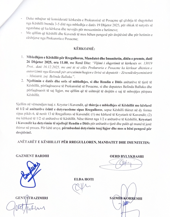 Në shkresë ata kërkojnë që mbledhja të zhvillohet ditën e premte, më 26 dhjetor, në orën 11:00.