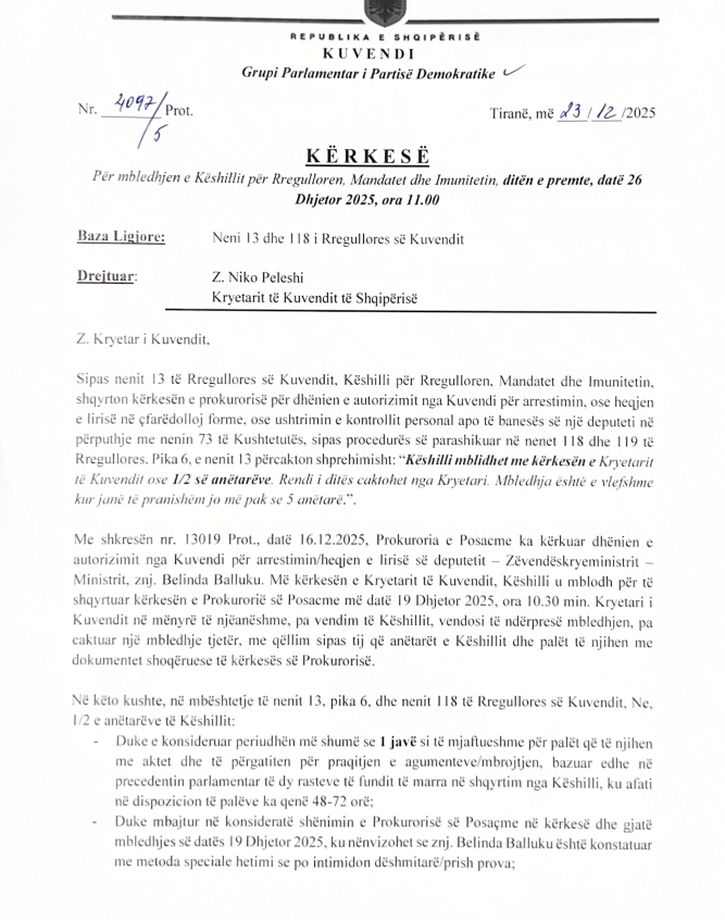 Anëtarët e Partisë Demokratike në Këshillin për Rregulloren, Mandatet dhe Imunitetin i kanë kërkuar Kryetarit të Kuvendit, Niko Peleshi, thirrjen e mbledhjes së këshillit për çështjen Balluku.