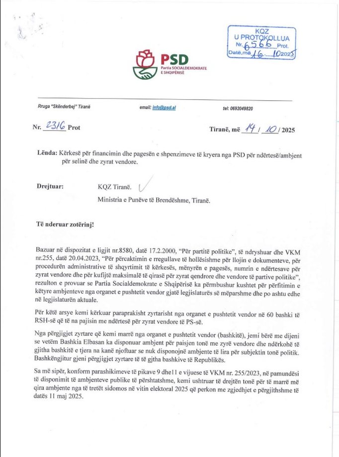 “Kemi kërkuar paraprakisht zyrtarisht nga organet e pushtetit vendor në 60 bashki të RSH-së që të na pajisin me ndërtesë për zyrat vendore të PSD-së. Nga përgjigjet zyrtare që kemi marrë nga organet e pushtetit vendor (bashkitë), jemi bërë me dijeni se vetëm Bashkia Elbasan ka disponuar ambient për pajisjen tonë me zyrë vendore dhe ndërkohë gjitha bashkitë e tjera na kanë njoftuar se nuk disponojnë ambiente të lira për subjektin tonë politik”, thuhet në kërkesën e PSD-së.