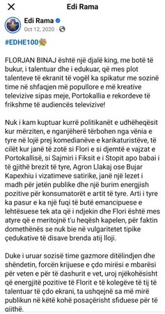 Gjatë një konference për mediat të hënën, kreu i PD e vlerësoi figurën e Binajt, por duket se këtë mendim e ndante edhe Rama, i cili në një postim në Facebook 5 vite më parë, e uronte për ditëlindje aktorin.