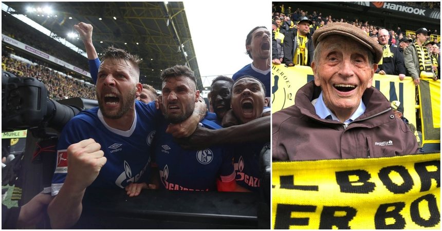 Zhgënjim në shkallët e stadiumit, ku ishte edhe një tifoz i veçantë i Dortmund, 99-vjeçari Friedrich Wegener. (A2 Televizion)